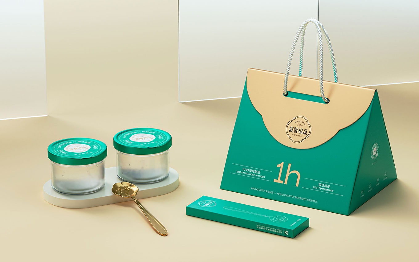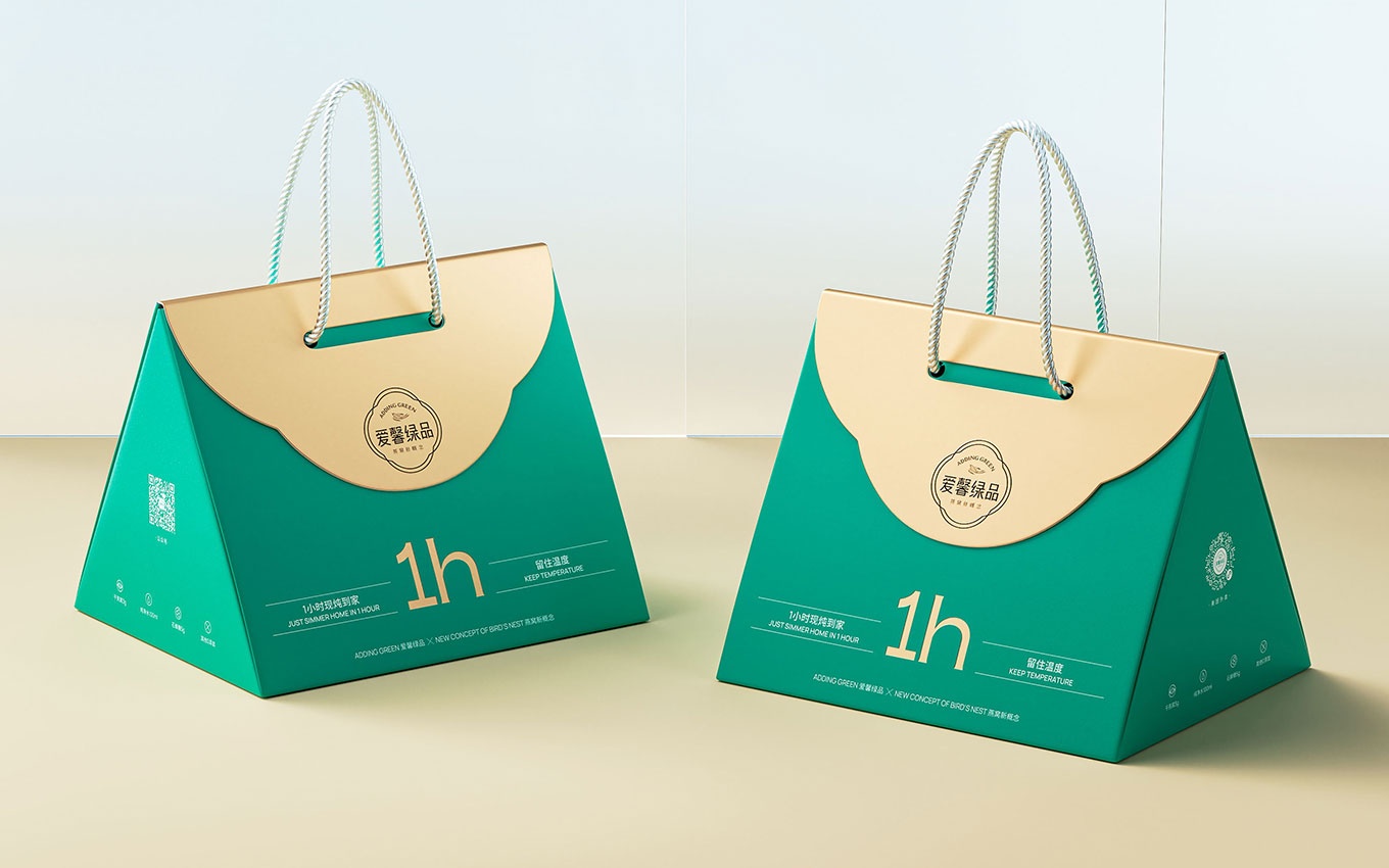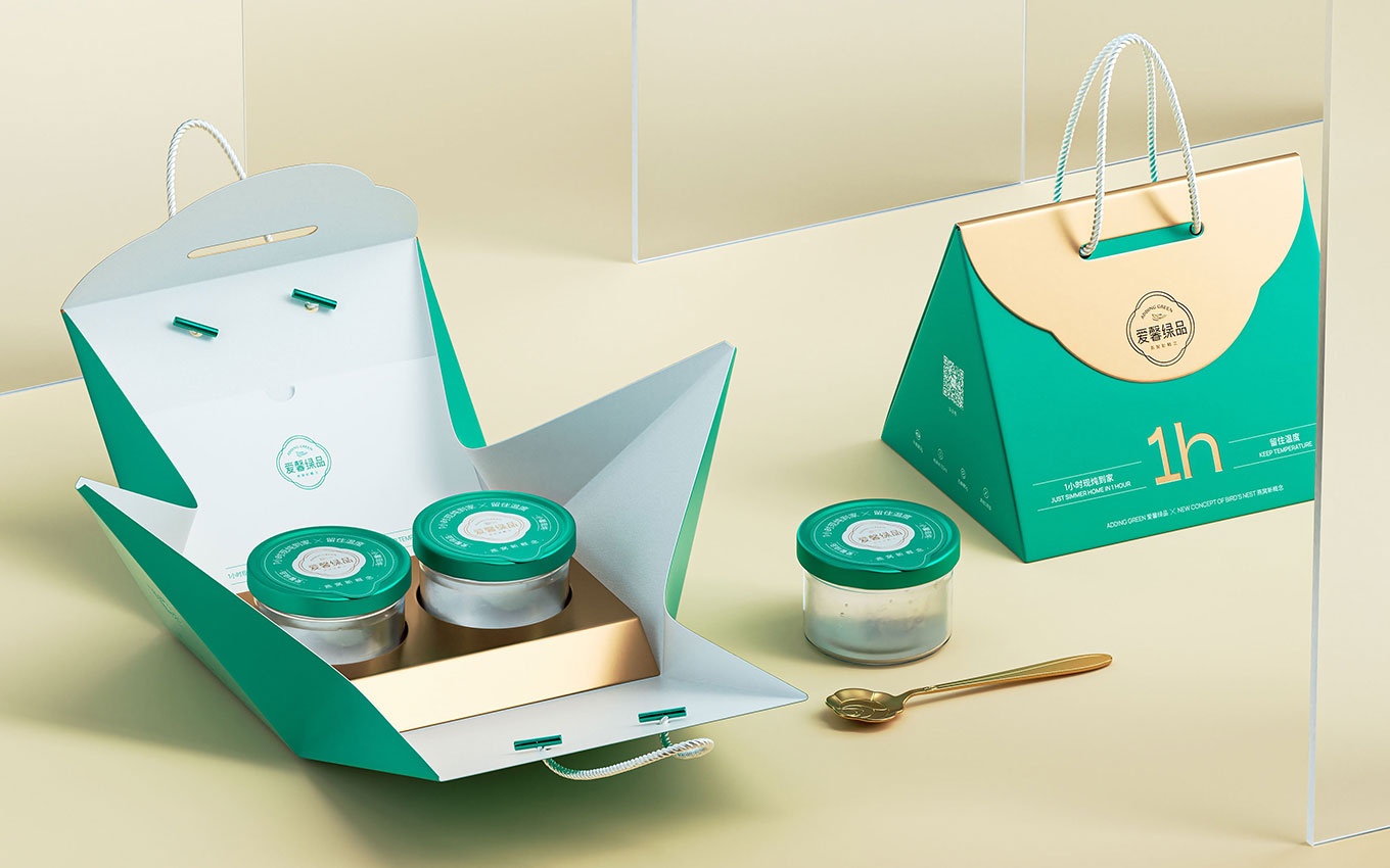 我們的設計團隊以提升產品在消費場景中的顏值為基礎,并在不增加包材成本的前提下,致力于讓包裝設計更具吸引力。最終,我們以大眾熟知的"手袋"樣式作為創(chuàng)意原點,為愛馨綠品現燉燕窩創(chuàng)造了全新的包裝設計。這種設計不僅使消費者能夠方便地拿到新鮮快速的外賣產品,還給予了禮品式的體驗,為品牌帶來了強烈的美譽度。